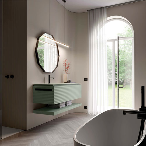 - Ceramics: porcelain tiles for floors and walls, large slabs and tiles for designing spacious rooms